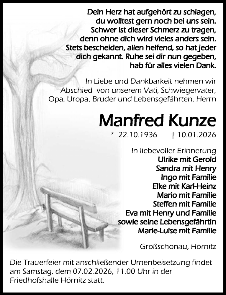 Hier finden Sie alle Traueranzeigen aus der Zeitung, die bisher für Manfred Kunze erschienen sind. Weitere Traueranzeigen, die in der Zeitung erscheinen, werden hier ebenfalls aufgelistet