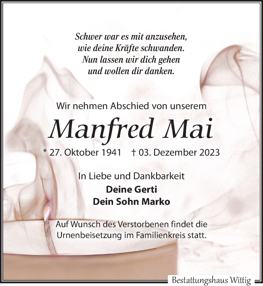Hier finden Sie alle Traueranzeigen aus der Zeitung, die bisher für Manfred Mai erschienen sind. Weitere Traueranzeigen, die in der Zeitung erscheinen, werden hier ebenfalls aufgelistet
