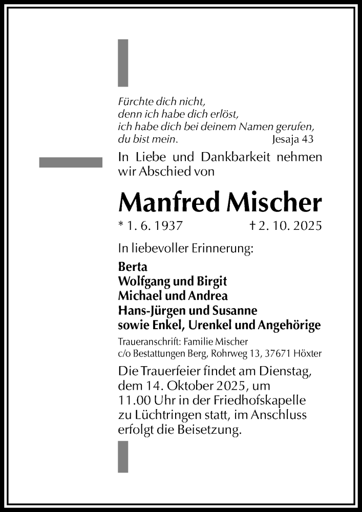 Hier finden Sie alle Traueranzeigen aus der Zeitung, die bisher für Manfred Mischer erschienen sind. Weitere Traueranzeigen, die in der Zeitung erscheinen, werden hier ebenfalls aufgelistet