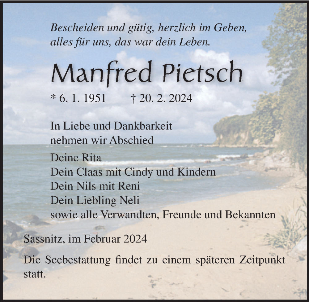 Hier finden Sie alle Traueranzeigen aus der Zeitung, die bisher für Manfred Pietsch erschienen sind. Weitere Traueranzeigen, die in der Zeitung erscheinen, werden hier ebenfalls aufgelistet
