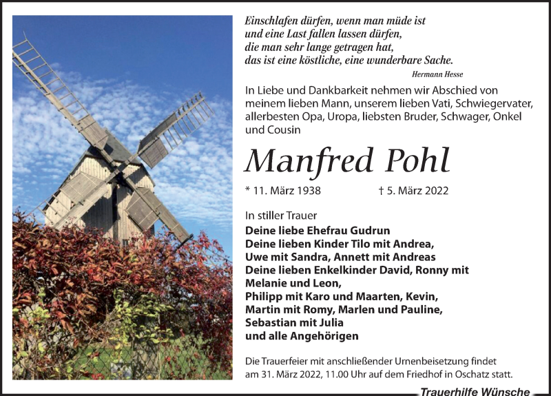 Hier finden Sie alle Traueranzeigen aus der Zeitung, die bisher für Manfred Pohl erschienen sind. Weitere Traueranzeigen, die in der Zeitung erscheinen, werden hier ebenfalls aufgelistet
