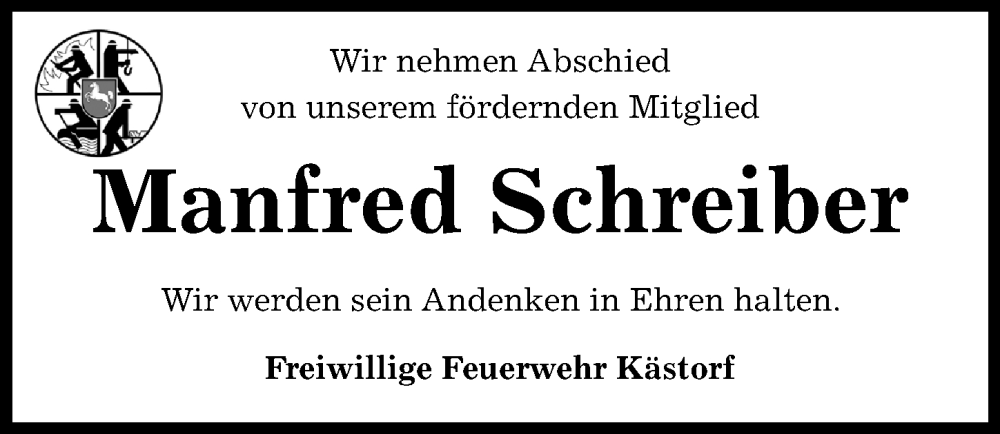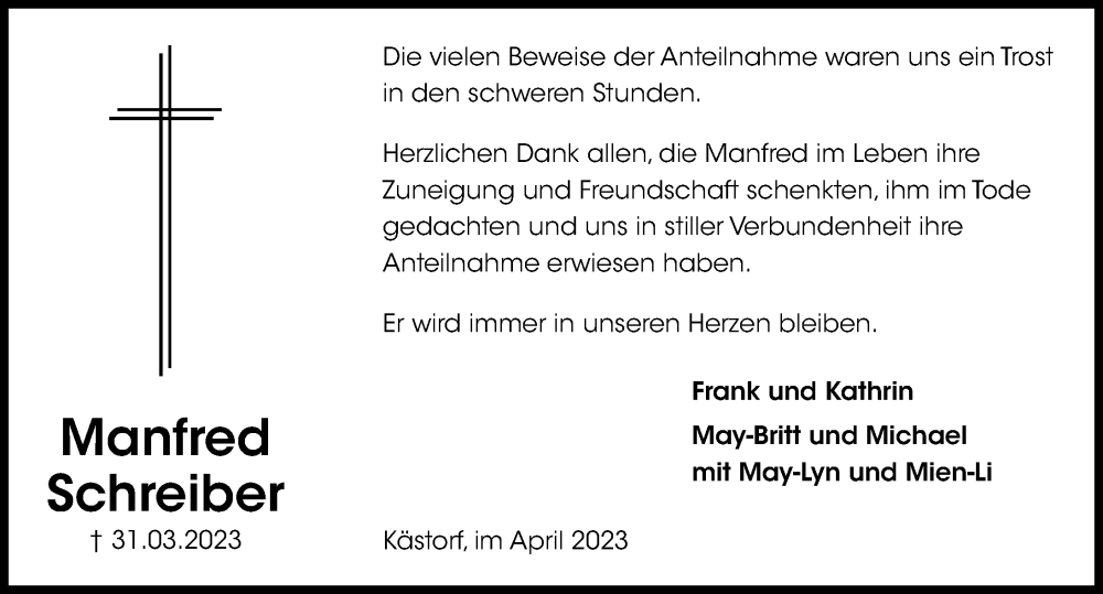 Hier finden Sie alle Traueranzeigen aus der Zeitung, die bisher für Manfred Schreiber erschienen sind. Weitere Traueranzeigen, die in der Zeitung erscheinen, werden hier ebenfalls aufgelistet
