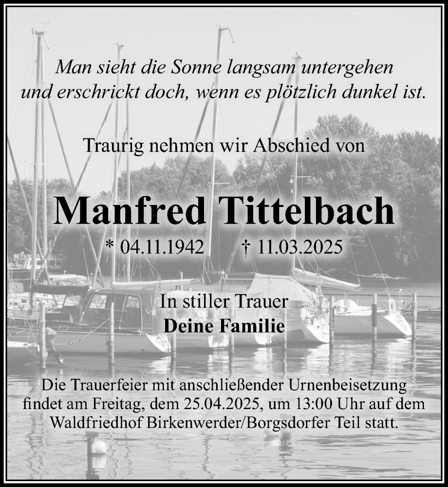 Hier finden Sie alle Traueranzeigen aus der Zeitung, die bisher für Manfred Tittelbach erschienen sind. Weitere Traueranzeigen, die in der Zeitung erscheinen, werden hier ebenfalls aufgelistet