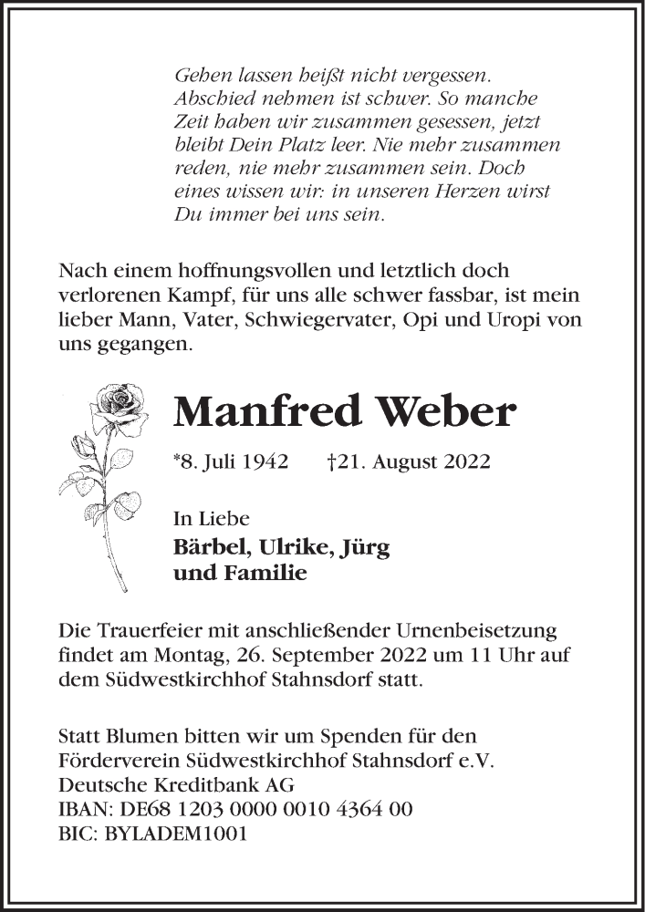Hier finden Sie alle Traueranzeigen aus der Zeitung, die bisher für Manfred Weber erschienen sind. Weitere Traueranzeigen, die in der Zeitung erscheinen, werden hier ebenfalls aufgelistet