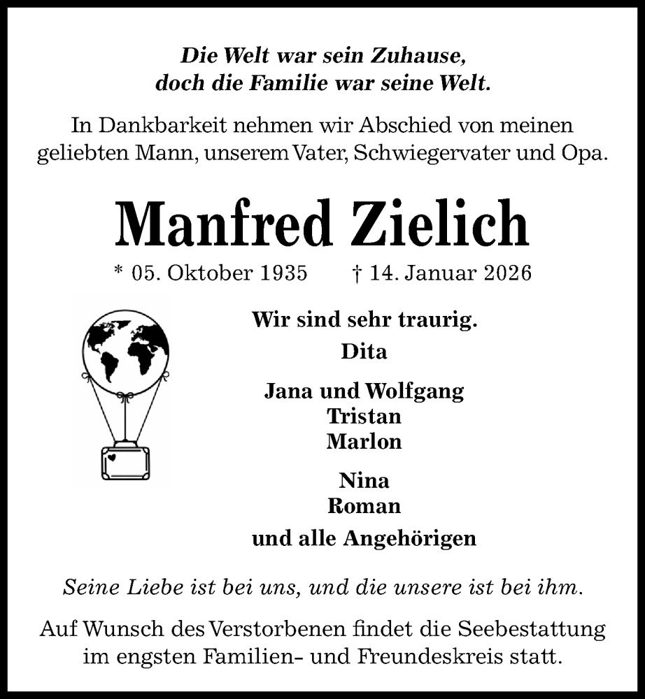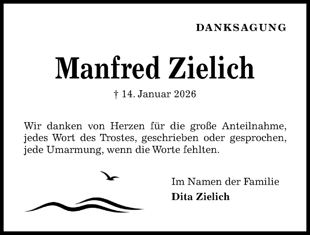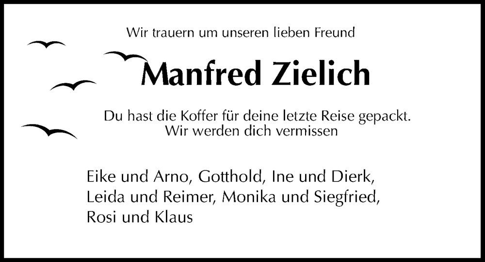 Hier finden Sie alle Traueranzeigen aus der Zeitung, die bisher für Manfred Zielich erschienen sind. Weitere Traueranzeigen, die in der Zeitung erscheinen, werden hier ebenfalls aufgelistet