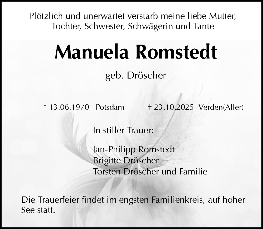 Hier finden Sie alle Traueranzeigen aus der Zeitung, die bisher für Manuela Romstedt erschienen sind. Weitere Traueranzeigen, die in der Zeitung erscheinen, werden hier ebenfalls aufgelistet