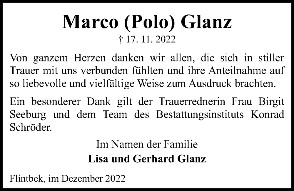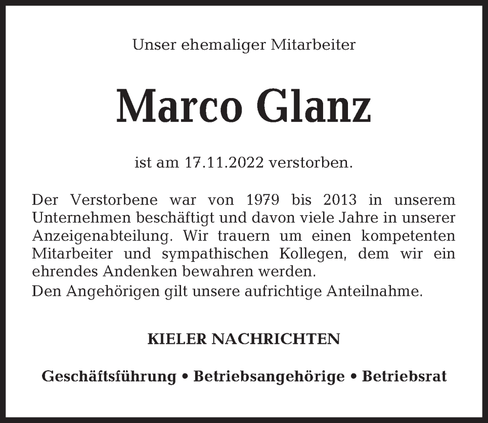 Hier finden Sie alle Traueranzeigen aus der Zeitung, die bisher für Marco Glanz erschienen sind. Weitere Traueranzeigen, die in der Zeitung erscheinen, werden hier ebenfalls aufgelistet