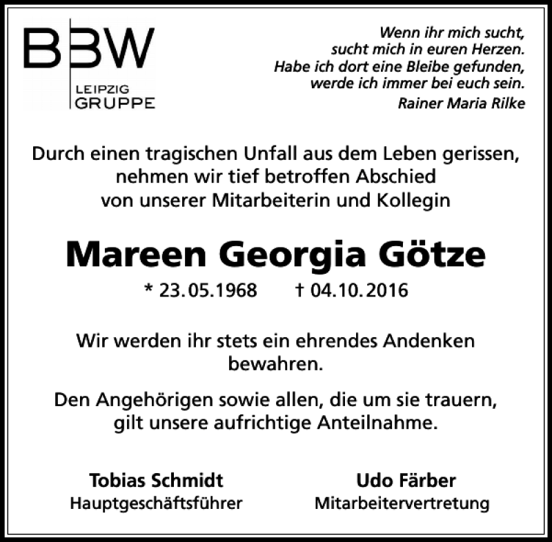 Hier finden Sie alle Traueranzeigen aus der Zeitung, die bisher für Mareen Georgia Götze erschienen sind. Weitere Traueranzeigen, die in der Zeitung erscheinen, werden hier ebenfalls aufgelistet