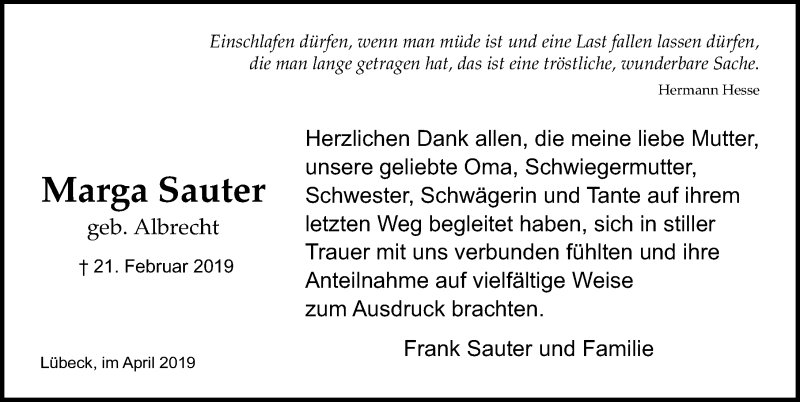 Hier finden Sie alle Traueranzeigen aus der Zeitung, die bisher für Marga Sauter erschienen sind. Weitere Traueranzeigen, die in der Zeitung erscheinen, werden hier ebenfalls aufgelistet
