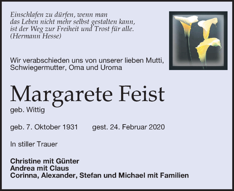 Hier finden Sie alle Traueranzeigen aus der Zeitung, die bisher für Margarete Feist erschienen sind. Weitere Traueranzeigen, die in der Zeitung erscheinen, werden hier ebenfalls aufgelistet