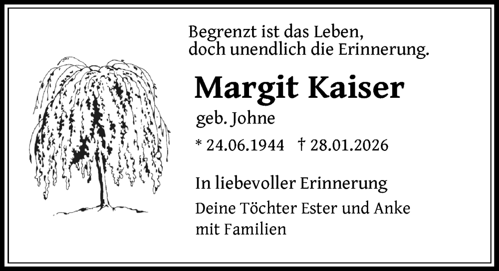 Hier finden Sie alle Traueranzeigen aus der Zeitung, die bisher für Margit Kaiser erschienen sind. Weitere Traueranzeigen, die in der Zeitung erscheinen, werden hier ebenfalls aufgelistet