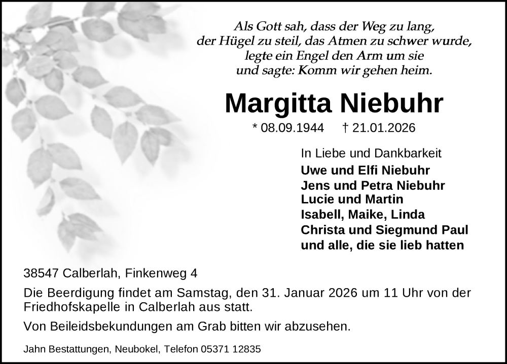 Hier finden Sie alle Traueranzeigen aus der Zeitung, die bisher für Margitta Niebuhr erschienen sind. Weitere Traueranzeigen, die in der Zeitung erscheinen, werden hier ebenfalls aufgelistet