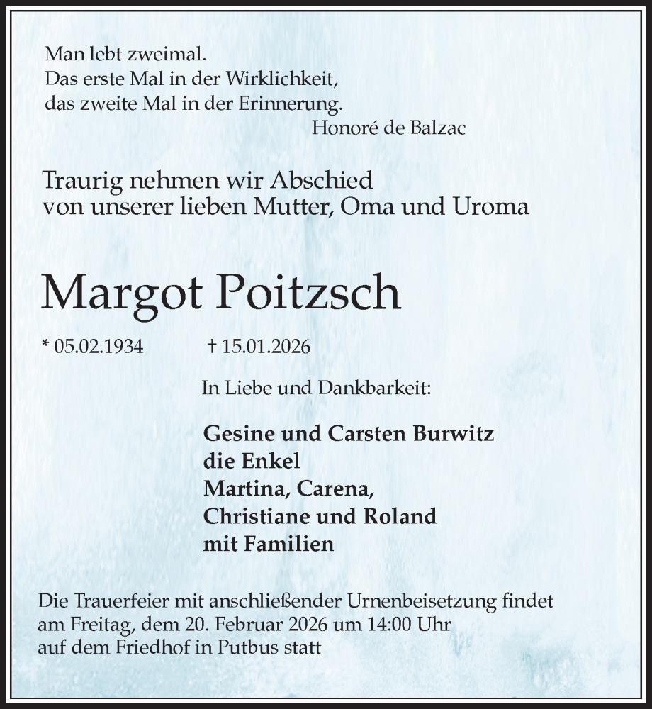 Hier finden Sie alle Traueranzeigen aus der Zeitung, die bisher für Margot Poitzsch erschienen sind. Weitere Traueranzeigen, die in der Zeitung erscheinen, werden hier ebenfalls aufgelistet