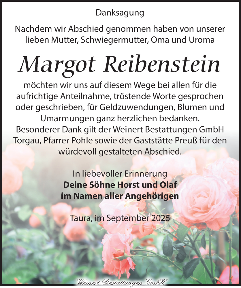Hier finden Sie alle Traueranzeigen aus der Zeitung, die bisher für Margot Reibenstein erschienen sind. Weitere Traueranzeigen, die in der Zeitung erscheinen, werden hier ebenfalls aufgelistet