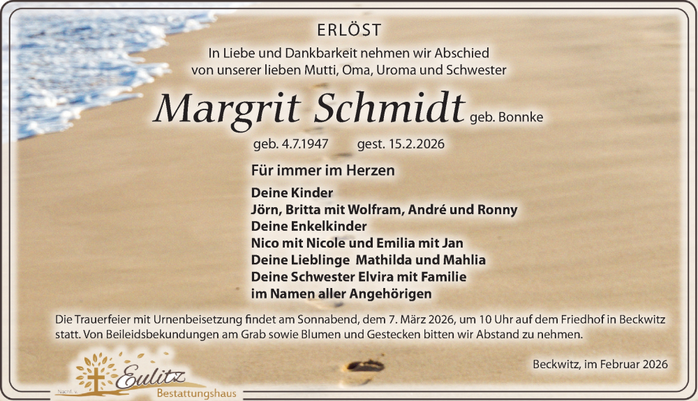 Hier finden Sie alle Traueranzeigen aus der Zeitung, die bisher für Margrit Schmidt erschienen sind. Weitere Traueranzeigen, die in der Zeitung erscheinen, werden hier ebenfalls aufgelistet