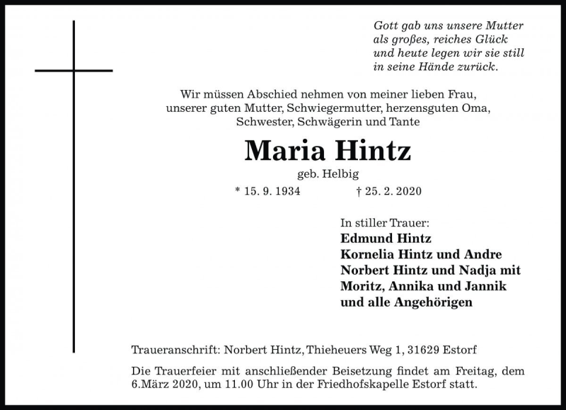 Hier finden Sie alle Traueranzeigen aus der Zeitung, die bisher für Maria Hintz erschienen sind. Weitere Traueranzeigen, die in der Zeitung erscheinen, werden hier ebenfalls aufgelistet