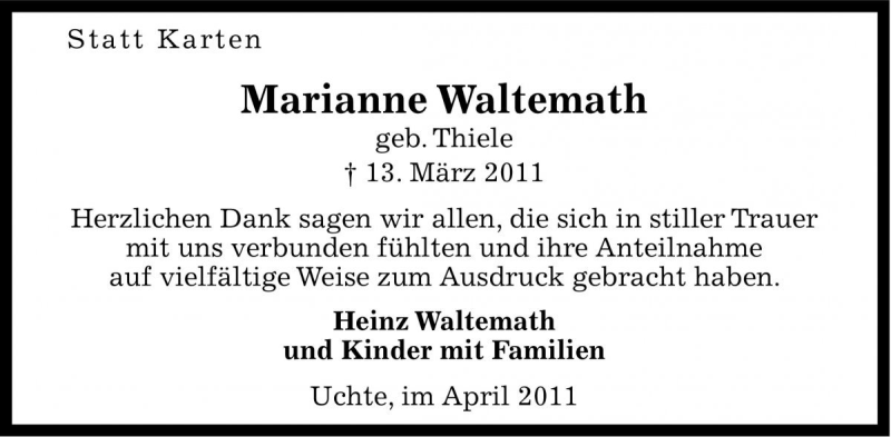 Hier finden Sie alle Traueranzeigen aus der Zeitung, die bisher für Marianne Waltemath erschienen sind. Weitere Traueranzeigen, die in der Zeitung erscheinen, werden hier ebenfalls aufgelistet