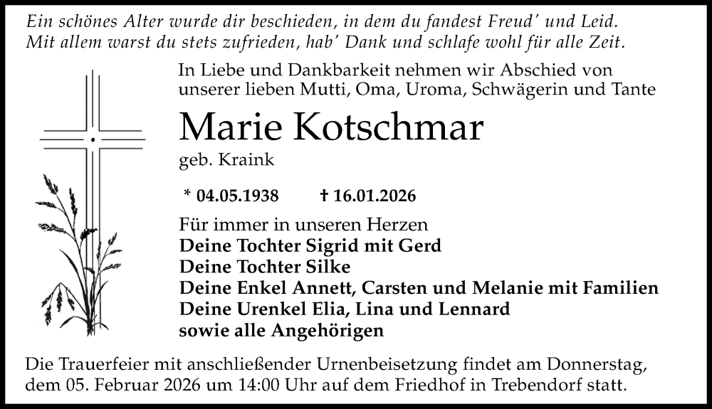 Hier finden Sie alle Traueranzeigen aus der Zeitung, die bisher für Marie Kotschmar erschienen sind. Weitere Traueranzeigen, die in der Zeitung erscheinen, werden hier ebenfalls aufgelistet