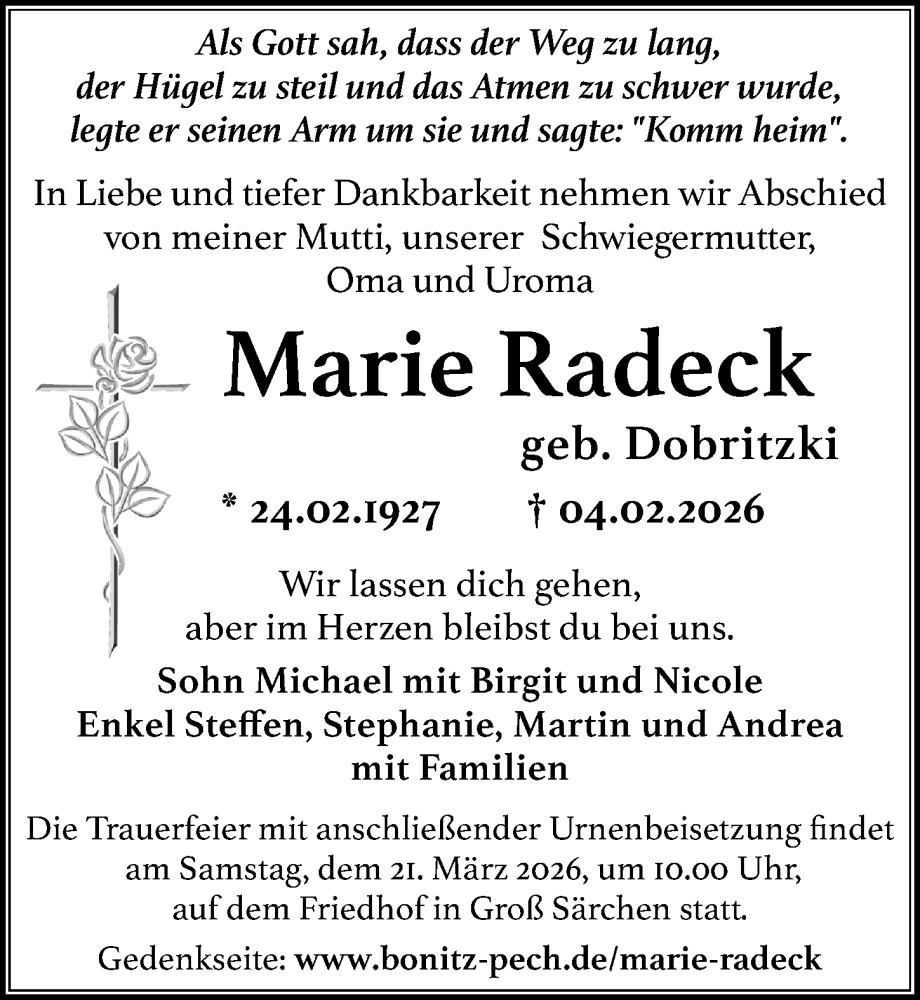 Hier finden Sie alle Traueranzeigen aus der Zeitung, die bisher für Marie Radeck erschienen sind. Weitere Traueranzeigen, die in der Zeitung erscheinen, werden hier ebenfalls aufgelistet