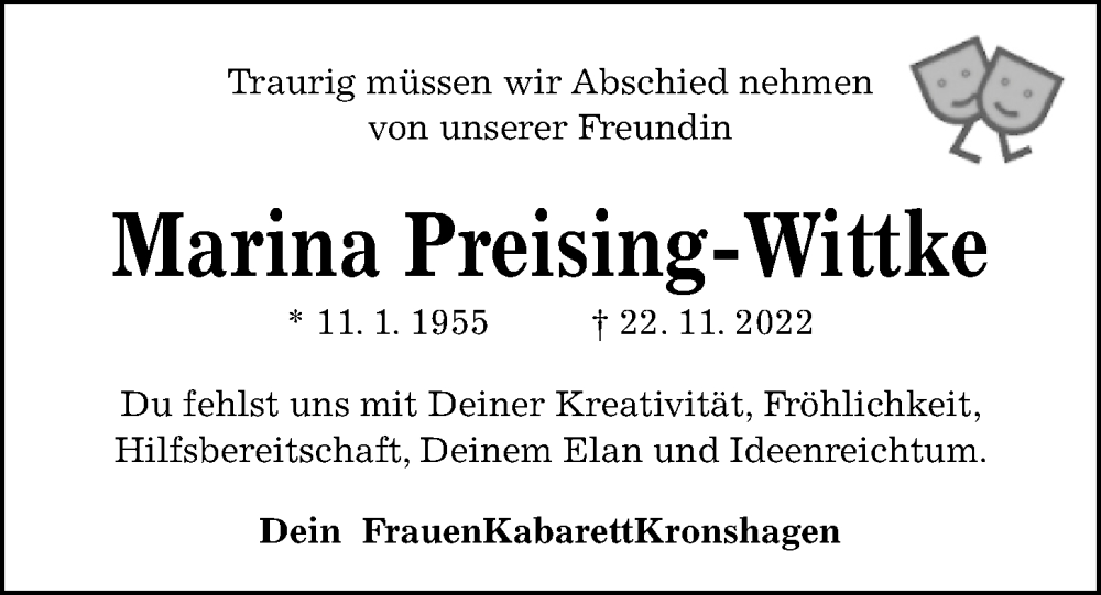Hier finden Sie alle Traueranzeigen aus der Zeitung, die bisher für Marina Preising-Wittke erschienen sind. Weitere Traueranzeigen, die in der Zeitung erscheinen, werden hier ebenfalls aufgelistet
