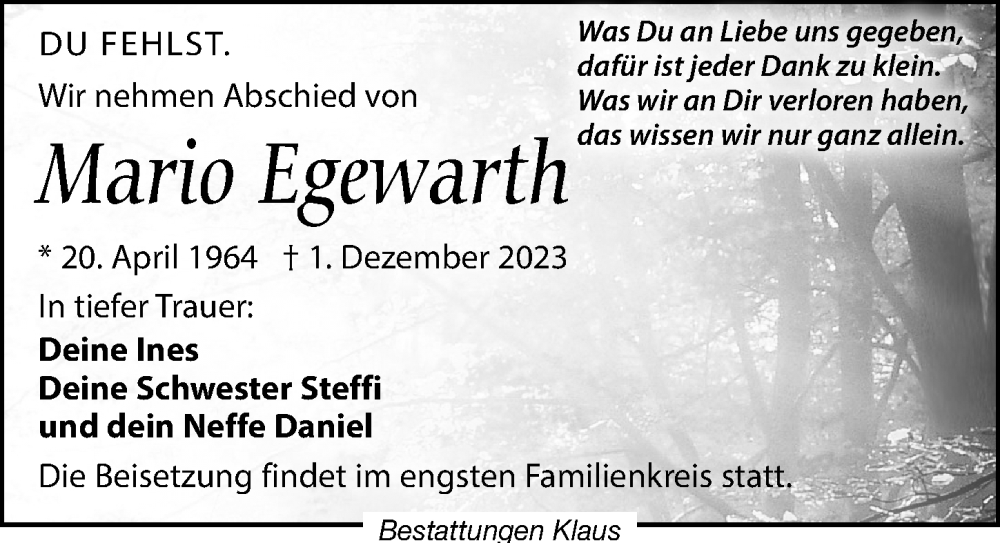 Hier finden Sie alle Traueranzeigen aus der Zeitung, die bisher für Mario Egewarth erschienen sind. Weitere Traueranzeigen, die in der Zeitung erscheinen, werden hier ebenfalls aufgelistet