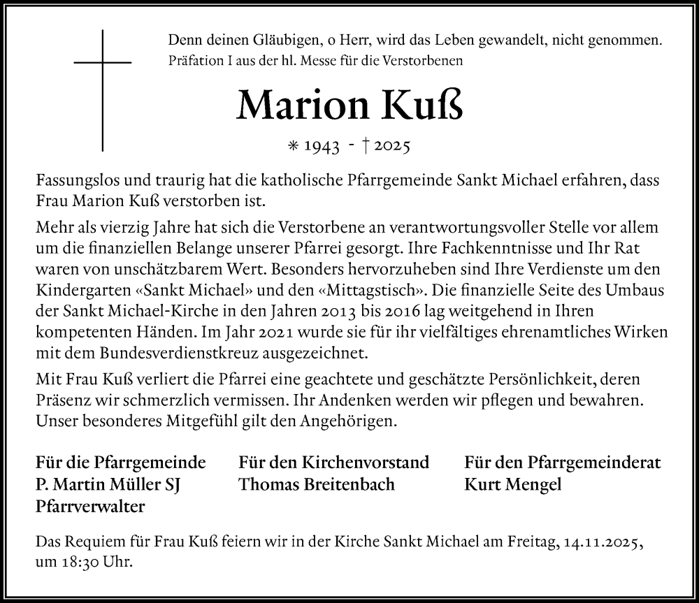 Hier finden Sie alle Traueranzeigen aus der Zeitung, die bisher für Marion Kuß erschienen sind. Weitere Traueranzeigen, die in der Zeitung erscheinen, werden hier ebenfalls aufgelistet