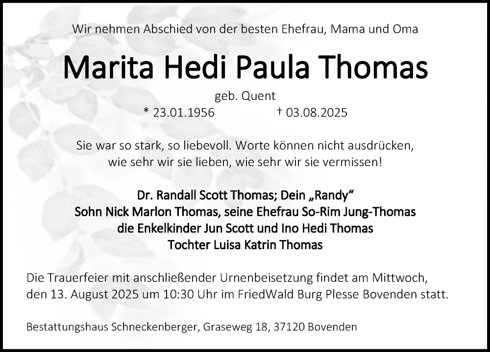 Hier finden Sie alle Traueranzeigen aus der Zeitung, die bisher für Marita Thomas erschienen sind. Weitere Traueranzeigen, die in der Zeitung erscheinen, werden hier ebenfalls aufgelistet