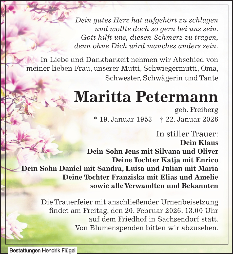 Hier finden Sie alle Traueranzeigen aus der Zeitung, die bisher für Maritta Petermann erschienen sind. Weitere Traueranzeigen, die in der Zeitung erscheinen, werden hier ebenfalls aufgelistet