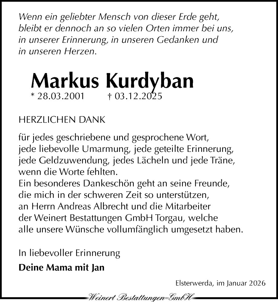 Hier finden Sie alle Traueranzeigen aus der Zeitung, die bisher für Markus Kurdyban erschienen sind. Weitere Traueranzeigen, die in der Zeitung erscheinen, werden hier ebenfalls aufgelistet