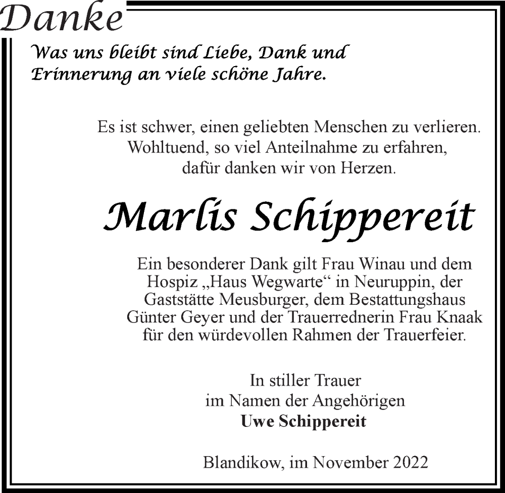 Hier finden Sie alle Traueranzeigen aus der Zeitung, die bisher für Marlies Schippereit erschienen sind. Weitere Traueranzeigen, die in der Zeitung erscheinen, werden hier ebenfalls aufgelistet