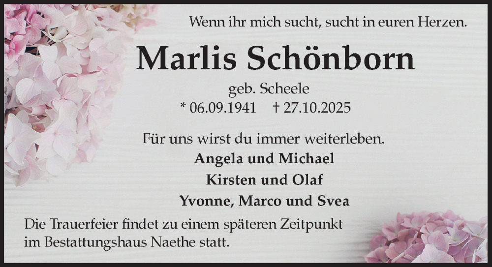 Hier finden Sie alle Traueranzeigen aus der Zeitung, die bisher für Marlis Schönborn erschienen sind. Weitere Traueranzeigen, die in der Zeitung erscheinen, werden hier ebenfalls aufgelistet