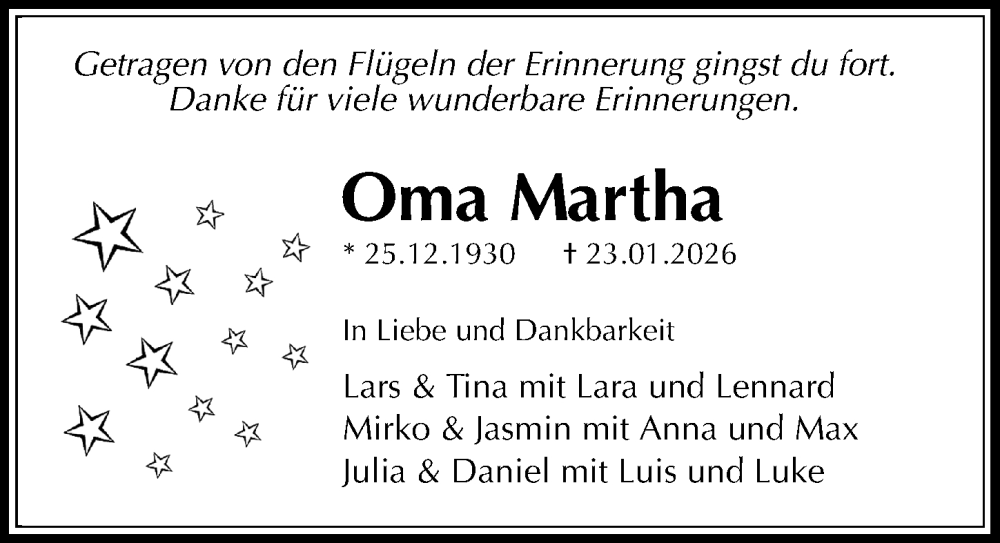 Hier finden Sie alle Traueranzeigen aus der Zeitung, die bisher für Martha erschienen sind. Weitere Traueranzeigen, die in der Zeitung erscheinen, werden hier ebenfalls aufgelistet