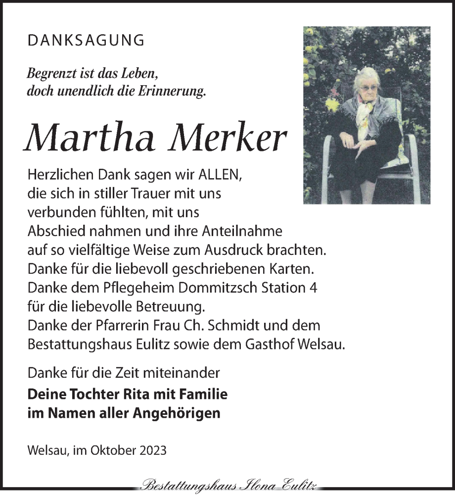 Hier finden Sie alle Traueranzeigen aus der Zeitung, die bisher für Martha Merker erschienen sind. Weitere Traueranzeigen, die in der Zeitung erscheinen, werden hier ebenfalls aufgelistet