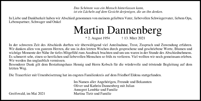 Hier finden Sie alle Traueranzeigen aus der Zeitung, die bisher für Martin Dannenberg erschienen sind. Weitere Traueranzeigen, die in der Zeitung erscheinen, werden hier ebenfalls aufgelistet