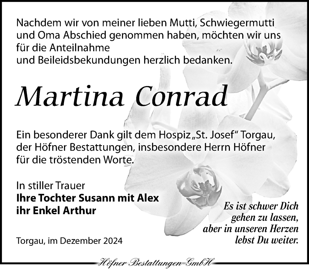 Hier finden Sie alle Traueranzeigen aus der Zeitung, die bisher für Martina Conrad erschienen sind. Weitere Traueranzeigen, die in der Zeitung erscheinen, werden hier ebenfalls aufgelistet