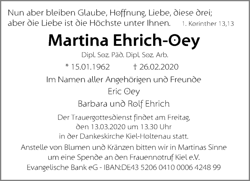 Hier finden Sie alle Traueranzeigen aus der Zeitung, die bisher für Martina Ehrich-Oey erschienen sind. Weitere Traueranzeigen, die in der Zeitung erscheinen, werden hier ebenfalls aufgelistet