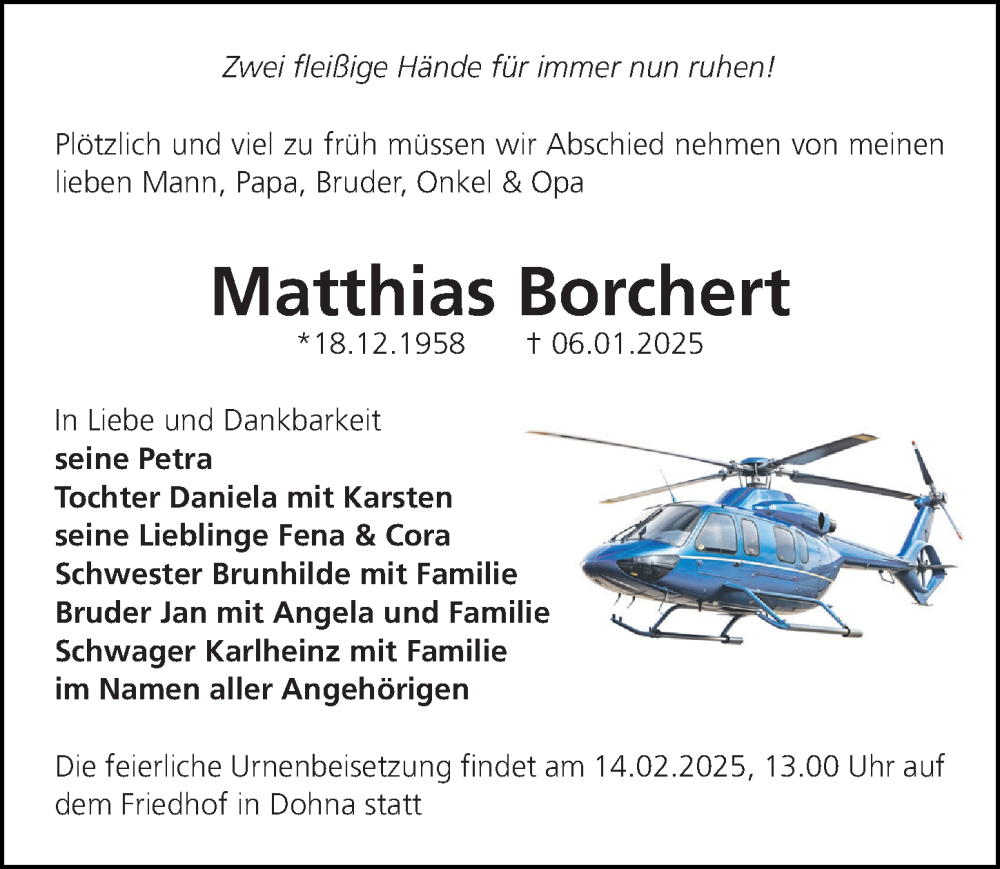 Hier finden Sie alle Traueranzeigen aus der Zeitung, die bisher für Matthias Borchert erschienen sind. Weitere Traueranzeigen, die in der Zeitung erscheinen, werden hier ebenfalls aufgelistet