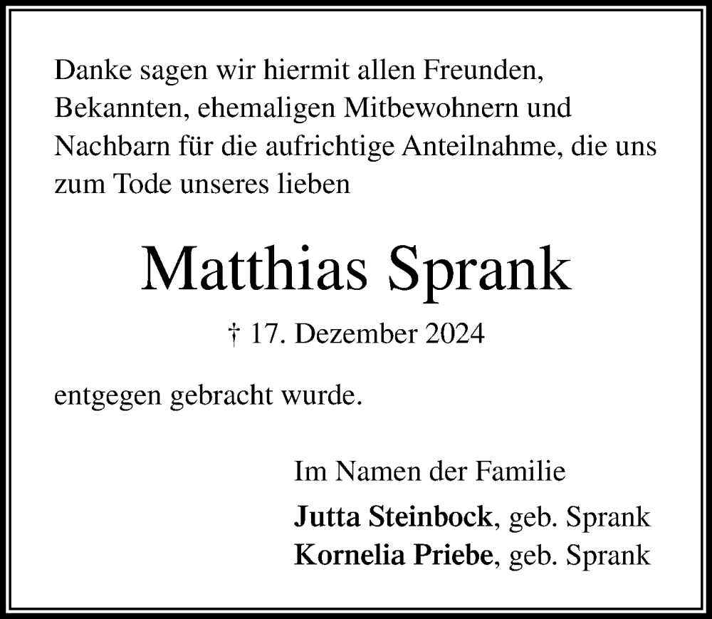 Hier finden Sie alle Traueranzeigen aus der Zeitung, die bisher für Matthias Sprank erschienen sind. Weitere Traueranzeigen, die in der Zeitung erscheinen, werden hier ebenfalls aufgelistet