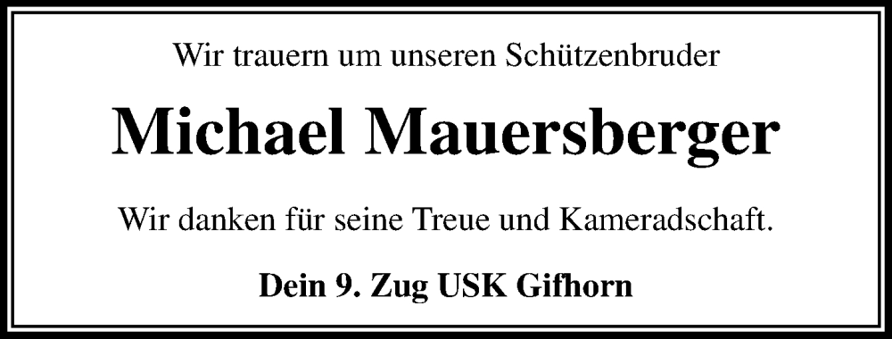 Hier finden Sie alle Traueranzeigen aus der Zeitung, die bisher für Michael Mauersberger erschienen sind. Weitere Traueranzeigen, die in der Zeitung erscheinen, werden hier ebenfalls aufgelistet