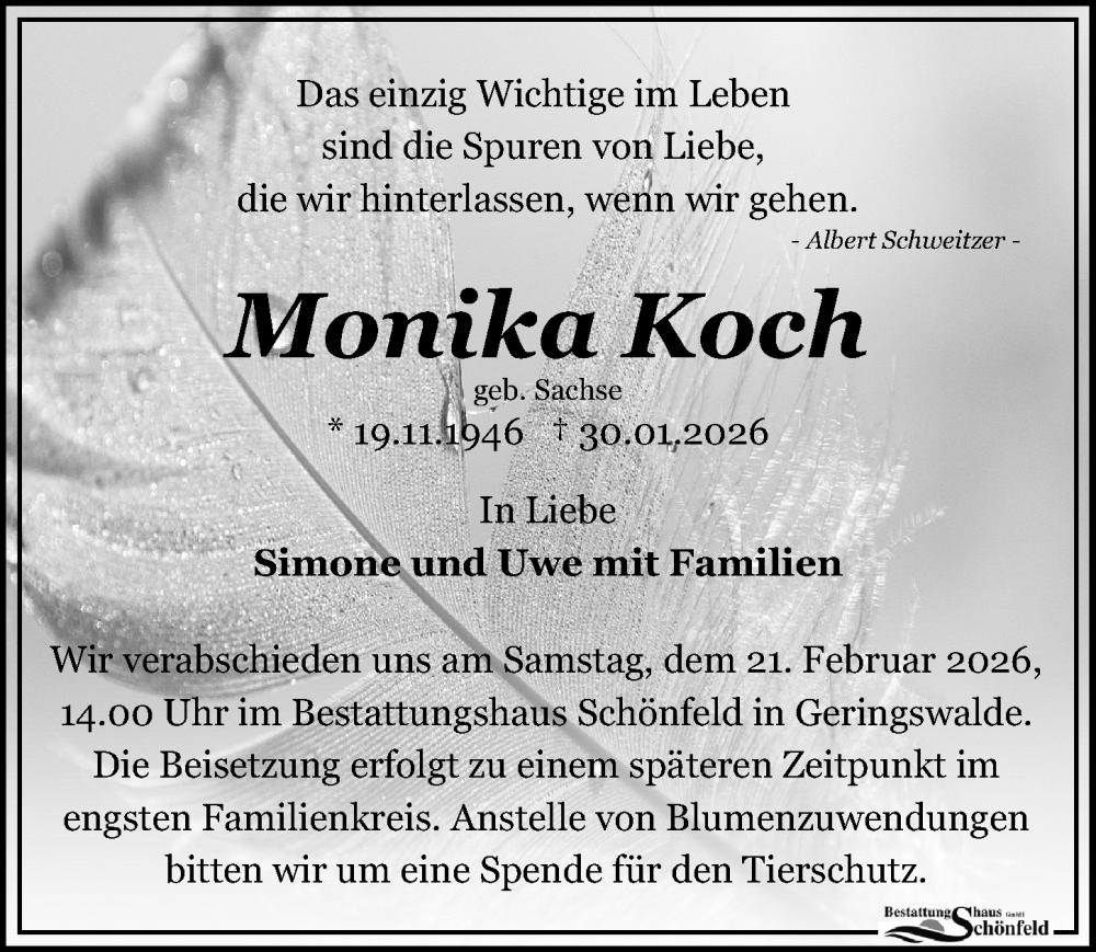 Hier finden Sie alle Traueranzeigen aus der Zeitung, die bisher für Monika Koch erschienen sind. Weitere Traueranzeigen, die in der Zeitung erscheinen, werden hier ebenfalls aufgelistet