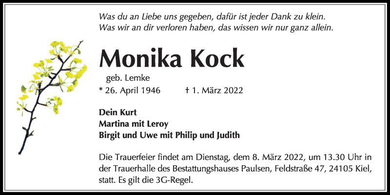 Hier finden Sie alle Traueranzeigen aus der Zeitung, die bisher für Monika Kock erschienen sind. Weitere Traueranzeigen, die in der Zeitung erscheinen, werden hier ebenfalls aufgelistet