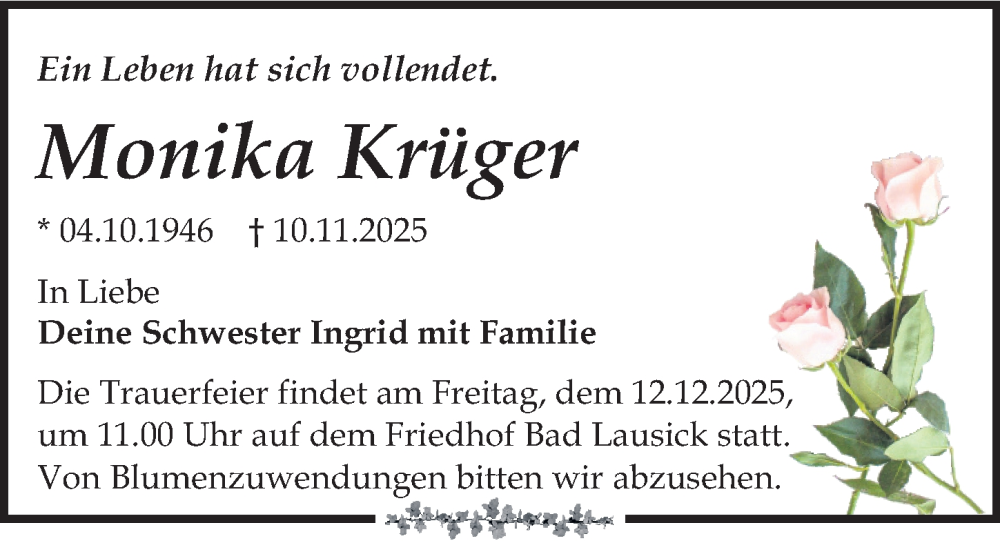 Hier finden Sie alle Traueranzeigen aus der Zeitung, die bisher für Monika Krüger erschienen sind. Weitere Traueranzeigen, die in der Zeitung erscheinen, werden hier ebenfalls aufgelistet