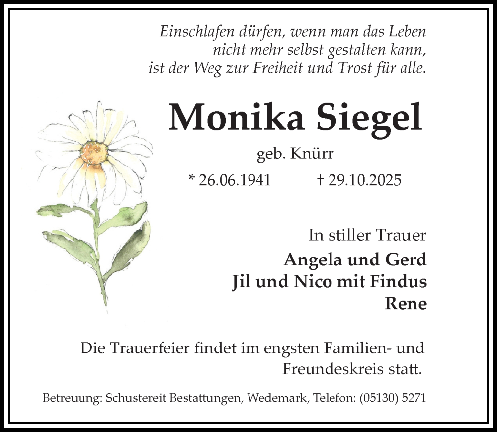 Hier finden Sie alle Traueranzeigen aus der Zeitung, die bisher für Monika Siegel erschienen sind. Weitere Traueranzeigen, die in der Zeitung erscheinen, werden hier ebenfalls aufgelistet