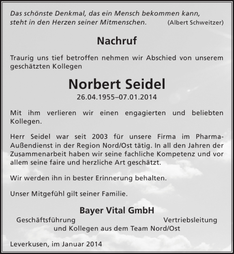 Hier finden Sie alle Traueranzeigen aus der Zeitung, die bisher für Norbert Seidel erschienen sind. Weitere Traueranzeigen, die in der Zeitung erscheinen, werden hier ebenfalls aufgelistet
