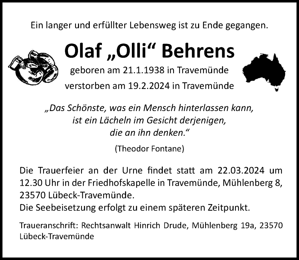 Hier finden Sie alle Traueranzeigen aus der Zeitung, die bisher für Olaf Behrens erschienen sind. Weitere Traueranzeigen, die in der Zeitung erscheinen, werden hier ebenfalls aufgelistet