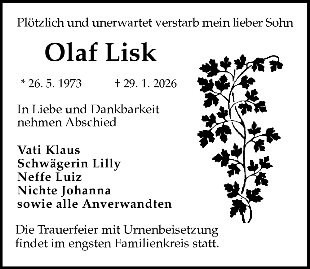 Hier finden Sie alle Traueranzeigen aus der Zeitung, die bisher für Olaf Lisk erschienen sind. Weitere Traueranzeigen, die in der Zeitung erscheinen, werden hier ebenfalls aufgelistet