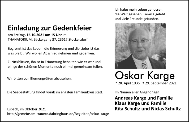 Hier finden Sie alle Traueranzeigen aus der Zeitung, die bisher für Oskar Karge erschienen sind. Weitere Traueranzeigen, die in der Zeitung erscheinen, werden hier ebenfalls aufgelistet