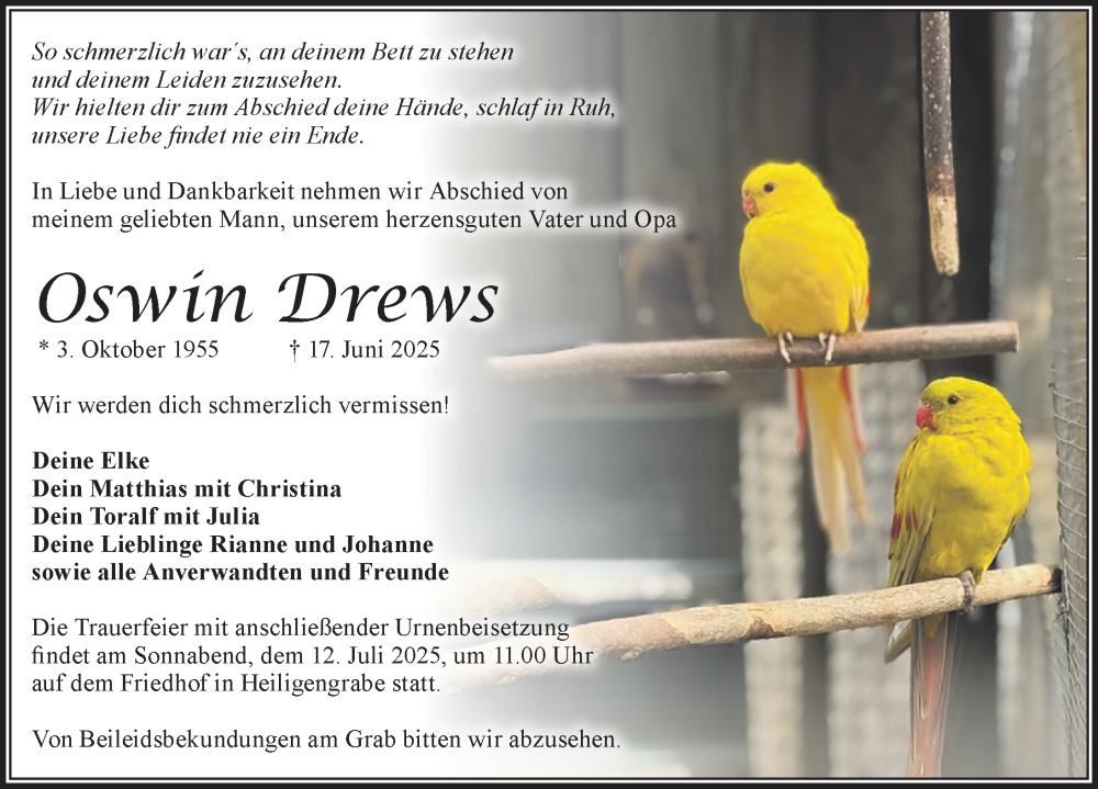Hier finden Sie alle Traueranzeigen aus der Zeitung, die bisher für Oswin Drews erschienen sind. Weitere Traueranzeigen, die in der Zeitung erscheinen, werden hier ebenfalls aufgelistet
