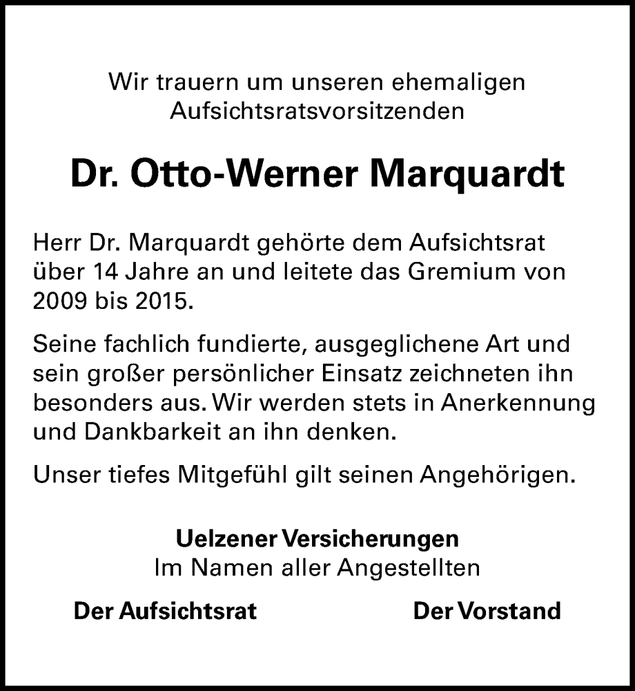 Hier finden Sie alle Traueranzeigen aus der Zeitung, die bisher für Otto-Werner Marquardt erschienen sind. Weitere Traueranzeigen, die in der Zeitung erscheinen, werden hier ebenfalls aufgelistet