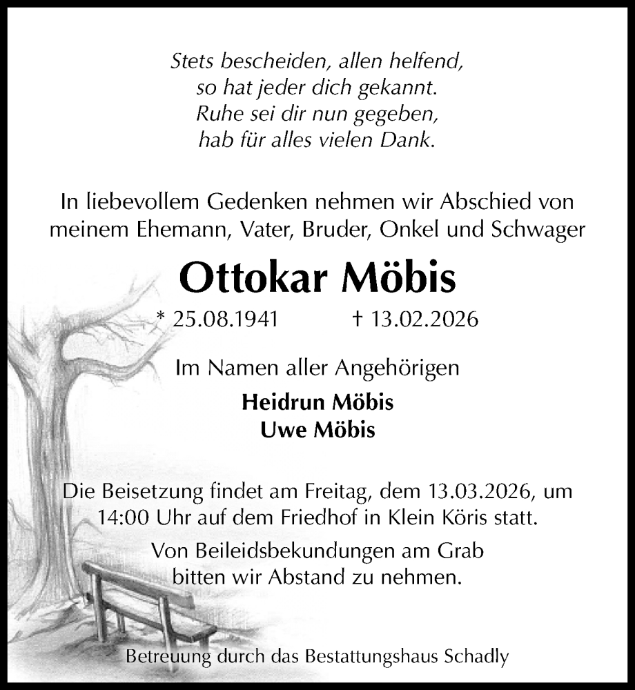 Hier finden Sie alle Traueranzeigen aus der Zeitung, die bisher für Ottokar Möbis erschienen sind. Weitere Traueranzeigen, die in der Zeitung erscheinen, werden hier ebenfalls aufgelistet